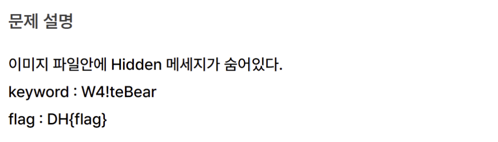 -> 드림핵 사이트 해당 문제에 들어가 참고하여 스테가노그래피 쪽으로 방향을 잡았다.