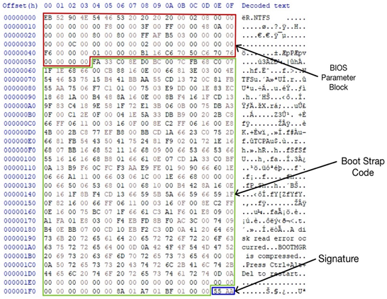 VBR (Volume Boot Record) 구조VBR은 Boot Sector와 NTLDR Information Boot Strap 두가지 영역으로 나뉜다. 1. Boot Sector : 운영체제가 컴퓨터를 부팅할 때 필요한 정보를 담고 있고, BIOS ParameterCPU JumpCommandBPB(BIOS Parameter Block)Boot Strap CodeSignature BIOS Parameter Block (BPB) :파일 시스템의 기본적인 정보를 담고 있으며, 드라이브의 구조, 파일 시스템의 크기, 섹터 크기 등을 정의시스템이 올바르게 액세스 할 수 있게 하는 중요한 메타 데이터를 제공한다. AddresssizeField NameDescription0x0000 ~ 0x00024b..