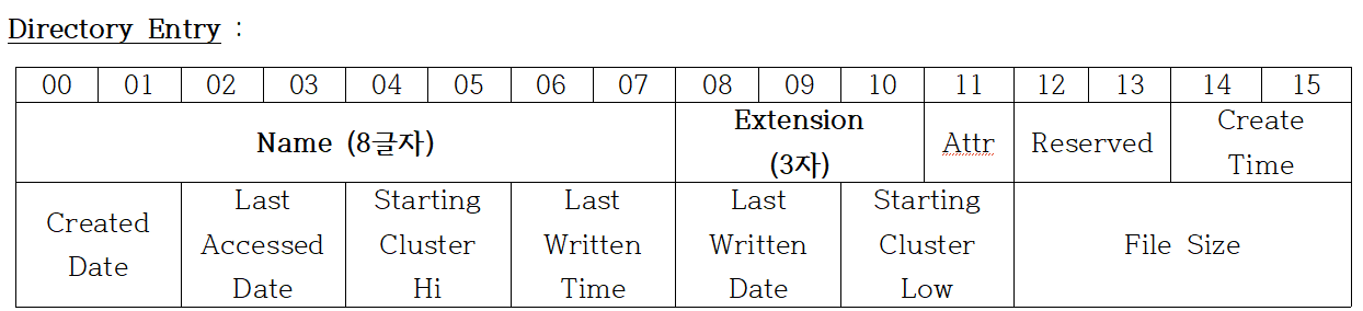 DATA area 구조파일이나 디렉토리 데이터가 실제로 저장되고 기록 됨.Data Area 부분의 첫 섹터는 'Root Directory' 가 저장됨.파일이나 디렉토리는 클러스터로 'Directory Entry' 라는 구조체 형식으로 저장. 크기는 32 byte 1. Directory Entry : : 파일 이름이 7byte 이하 = "Regular Directory Entry" 파일 이름이 8byte 이상 = "Long name Directory Entry" 오프셋 설명Name 이름Extension확장자Attr속성Reserved12바이트의 내용은 windows NT의 예약 공간으로 0으로 채워짐 13은 생성된 시간 기록(1/10초 단위)Create Time파일 생성 시간Cre..